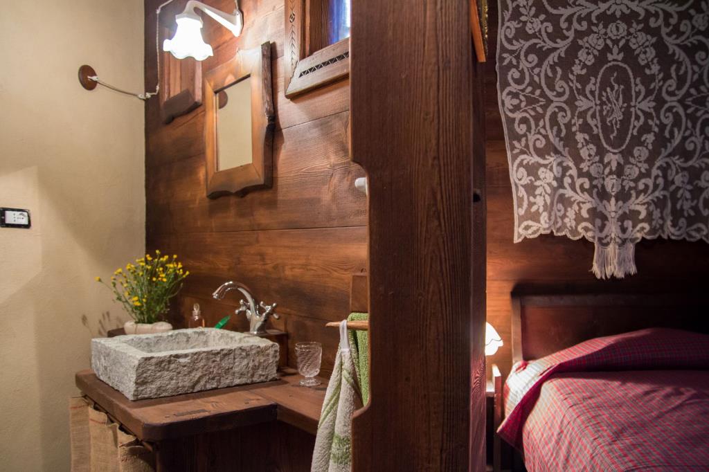 La camera è realizzata con rivestimenti in legno e materiali locali, riscaldamento a pavimento e stufa a legna funzionante.