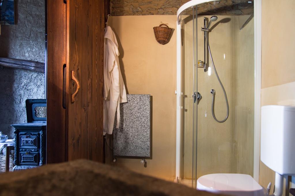 Deliziose e confortevoli camere singole, con stufa a legna (oltre al riscaldamento a pavimento) e bagno con doccia e lavandino in pietra lavorata a mano
