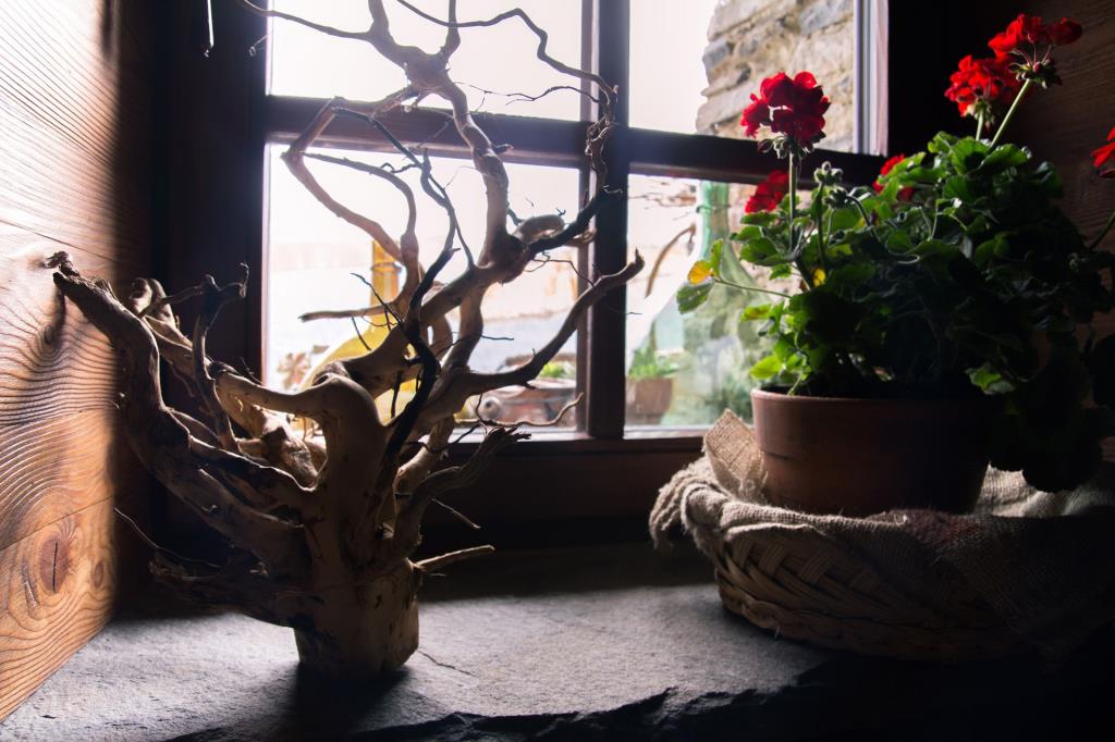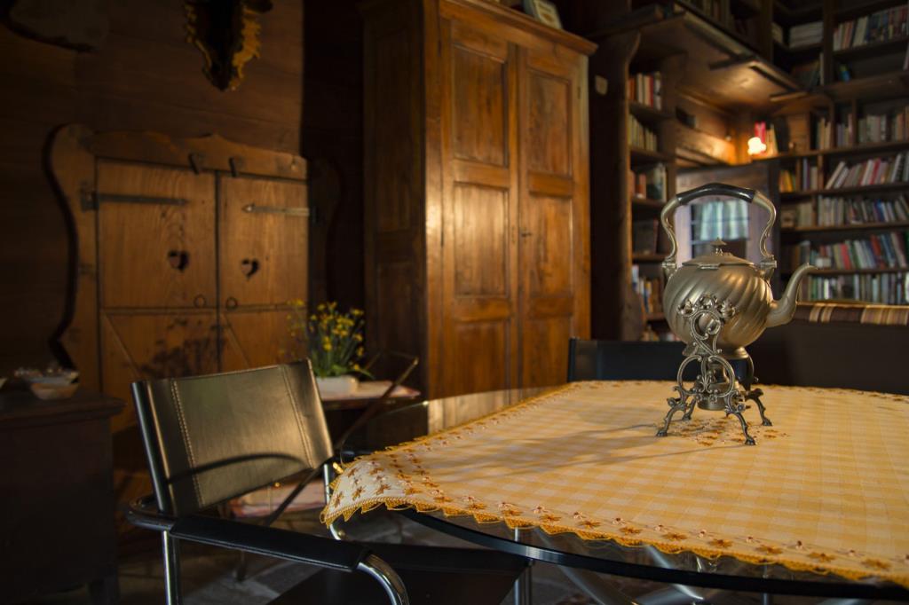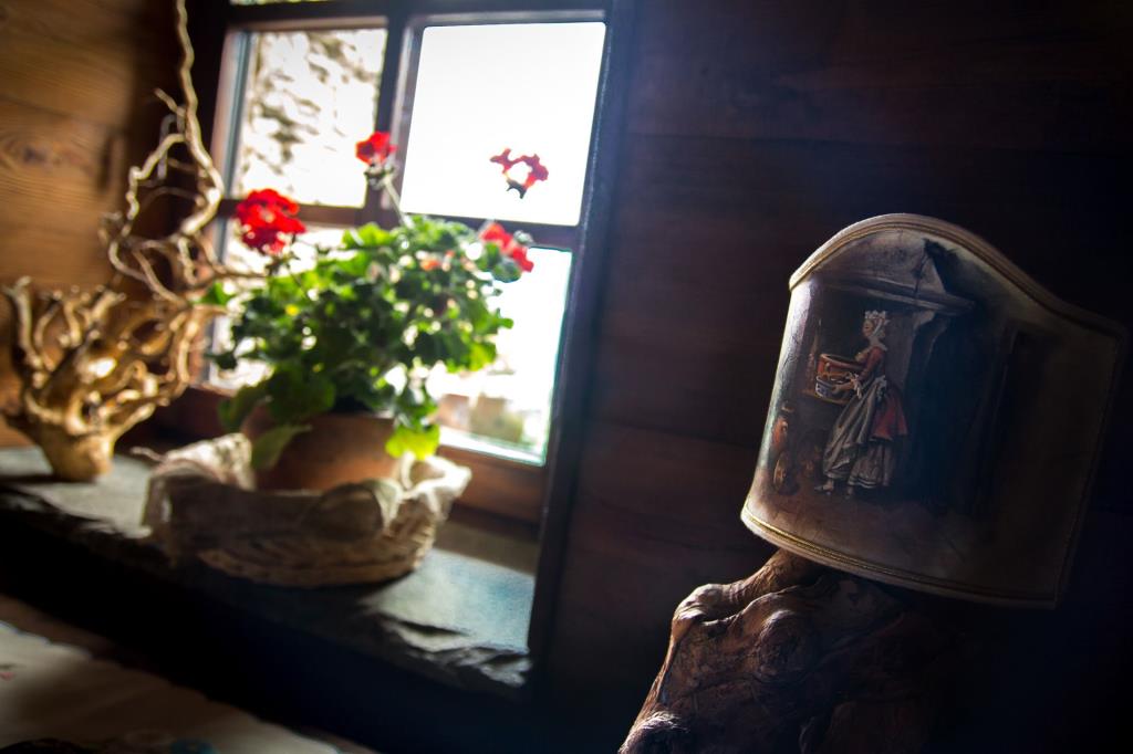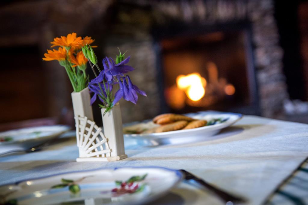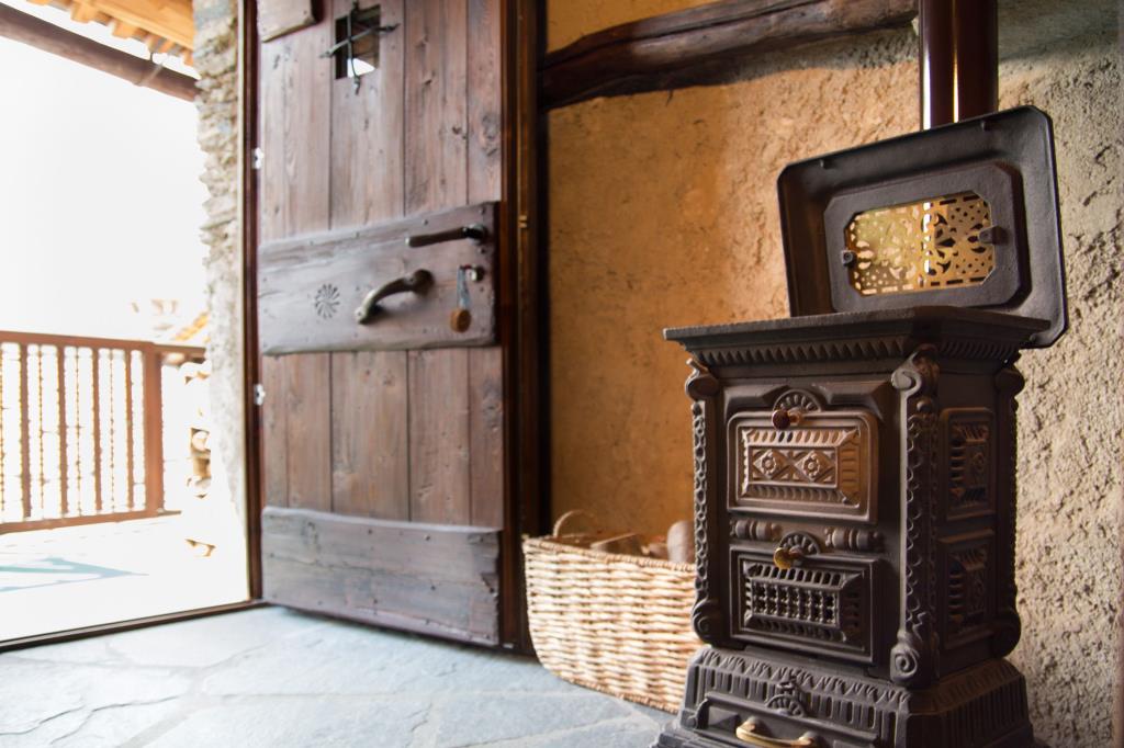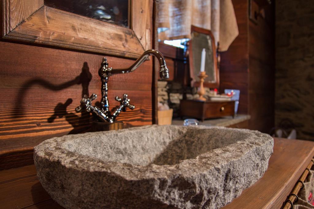 Poche stanze, arredate con amore e cose antiche, con pareti rivestite di caldo legno, pavimenti in pietra e legno, ciascuna con camino o stufa, bagno e doccia. Tutto naturale, tutto da toccare, i lavandini in pietra, i lampadari antichi, gli interruttori in ceramica e fili a vista ma, nascosta, la coibentazione in fibra di legno, la tecnologia del riscaldamento a pavimento, la produzione di energia fotovoltaica e solare termico.